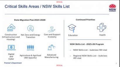 11월 25일 부터 오늘 (금요일)까지 하루 2시간 15분간 MIA 협회에서 온라인으로 주관하는 State and Territory Symposium을 참가하였습니다. 이때 얻는 정보를 공유합니다. 아래 자료는 오늘 NSW주에서 발표한 내용의 한 부분을 screen dump 한 것입니다. 이 내용은 Critical Skills Areas라고 해서 190 비자를 위한 nomination을 받는데 있어 가장 좋은 직업군이라는 뜻입니다. Health, Education, ICT (Digital and Cyber), and Construction (Infrastructure and Housing). Other key sectors include the Care Economy (Aged Care, Disability, and Early Childhood), Renewables (Net Zero and Clean Energy), Agriculture and Agri-food, and Advanced Manufacturing. These priority sectors are used to guide the state’s updated Skills Lists for the 2025-26 program year. (SA)남호주의 경우는 아래와 같은 분야에 있는 분들이 우선 190 비자를 위한 nomination 을 받게 된다고 발표했습니다. health and medical sciences, trades and construction, defence, space, and cybersecurity, and education. (보건 및 의학 과학, 기술직 및 건설, 국방, 우주, 사이버 보안, 그리고 교육 분야)