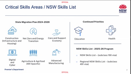 11월 25일 부터 오늘 (금요일)까지 하루 2시간 15분간 MIA 협회에서 온라인으로 주관하는 State and Territory Symposium을 참가하였습니다. 이때 얻는 정보를 공유합니다. 아래 자료는 오늘 NSW주에서 발표한 내용의 한 부분을 screen dump 한 것입니다. 이 내용은 Critical Skills Areas라고 해서 190 비자를 위한 nomination을 받는데 있어 가장 좋은 직업군이라는 뜻입니다. Health, Education, ICT (Digital and Cyber), and Construction (Infrastructure and Housing). Other key sectors include the Care Economy (Aged Care, Disability, and Early Childhood), Renewables (Net Zero and Clean Energy), Agriculture and Agri-food, and Advanced Manufacturing. These priority sectors are used to guide the state’s updated Skills Lists for the 2025-26 program year. (SA)남호주의 경우는 아래와 같은 분야에 있는 분들이 우선 190 비자를 위한 nomination 을 받게 된다고 발표했습니다. health and medical sciences, trades and construction, defence, space, and cybersecurity, and education. (보건 및 의학 과학, 기술직 및 건설, 국방, 우주, 사이버 보안, 그리고 교육 분야)