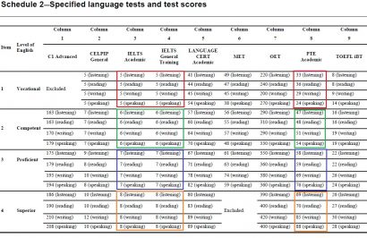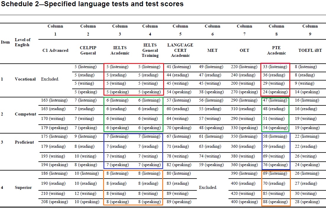 2025년 8월 5일 부터 영어시험 ((IELTS, OET 및 PTE 등 포함)을 치룬 경우는 아래와 같은 점수 분포를 토대로 비자신청에 이용되며 2025년 8월 5일 이전에 시험 본 것은 기존의 점수 분포를 토대로 비자신청에 사용됩니다.